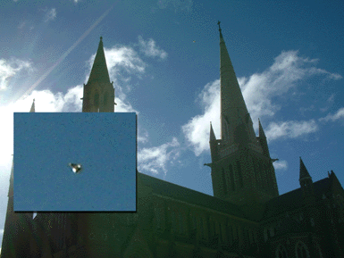 I was in Bendigo on the 13th June last year and was taking some pictures of St Marys Cathedral in Bendigo. I did not notice anything unusual although the object is small and high in the sky so it would not have been easily seen. I found it after I had loaded the pictures on to my PC. The object in question is next to the right hand spire of the cathedral, fairly high in the sky and appears to be reflective considering the position of the sun at the time. Also photos taken approximately 15 to 20 secs either side of this photo show no signs of the object at all. It is has not been altered in any way an my camera imprints all relevant info about the time,date,f:stop, shutter speed etc |