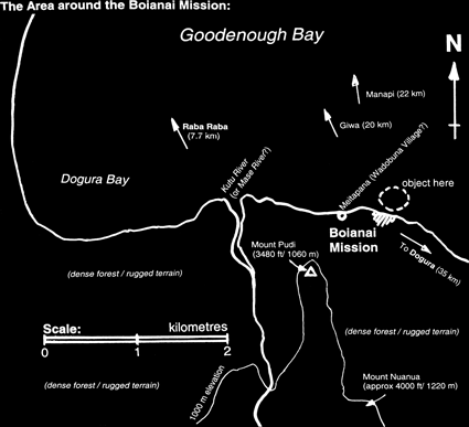 | about a quarter of a mile out to sea, near Boianai station. "Stephen Moi told me "this thing stopped and remained stationary for about half a minute. Gradually it decreased in brilliance until the shape of an inverted saucer could be seen." "At his request and to his dictation I wrote a formal report of what he had seen. I sent a copy of it, along with my own comments, to the Rev. D. Durie Acting Principal of St. Aidan's College, Dogura. "I, personally, was still sceptical."