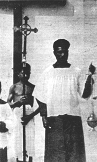 | Stephen Moi, one of the Papuan teachers who was present most of the time that the strange "flying Objects" were observation. This picture was taken outside the mission church. Moi was one of the men who waved at the figures that appeared on the "ship." | |||||||||||||||||||||