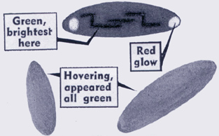 Then things happened fast. When about 40 degrees above the horizon, the object changed course with a rightangled movement, and dived towards the vehicles's headlughts. Within a second it had enlarged from about the size of a tea-saucer size to a mass measuring at least three feet. It was glowing a bright reddish-orange colour as it flased towards the car. Mr Kukla put up both arms in an instinctive geture. "Then I put my foot on the brake, and with my hands and arms up called, "it's going to crash on us!" he said. Mrs Lawrence called out: "Kill the engine, switch the lightw off and get out to the bush." The car stopped they switched of the headlights, and got out of the car, they looked at the object. It had stopped in midair, and was hovering, now green in colour and rocked gently from tip to tip. "It was impossible to judge what distance it waas from us," said Mr Kukla. After a while, he went back to the car and got a 7 x 40 monocular lense to observe the object, which was stillhovering in slience soem distance away. His bull terrier Snowy, normally first out of the car whenever it stopped, was crouched in the back seat, her heckles up. She refused to budge. Resting the lens on the car, Mr Kukla got a good look at the object. His first impression was of a shape rather like a squashed football or a magnifying lens viewed from the side. THen his reaction was aas if her were looking at a bright green cell or nucleus under a microscope. |