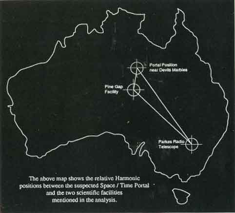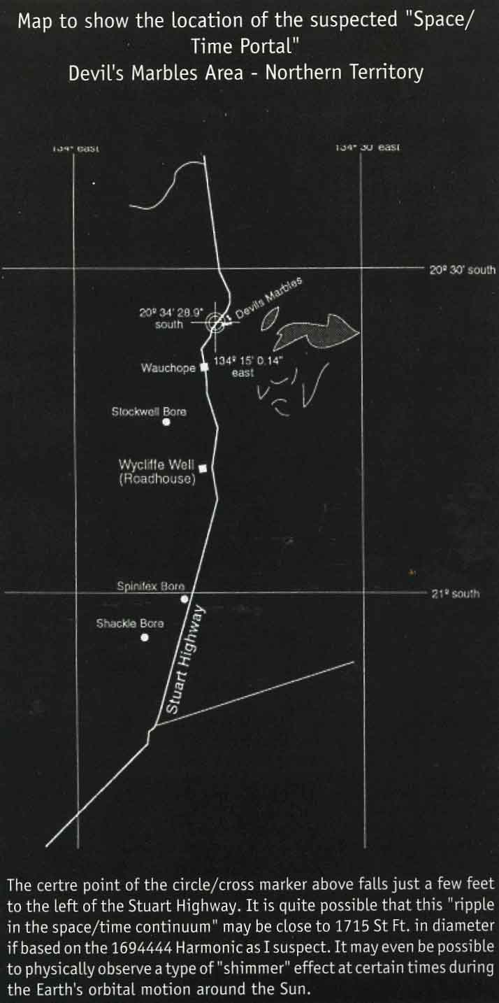 Reciprocal Longitude value found = 45deg 44'59.86"west = 45.7499612 deg This is the Harmonic of Mass at the Centre of a Unified Light Field and is the correct harmonic to be associated with the matter/ Anti-matter transfer if my theory is valid. This reciprocal Iongitude value allowed me to obtain the reverse by subtracting it from 180 which gave 134 deg 15' 0.14" east. This, together with the above latitude Value, marked a position just slightly to the left of the Stuart Highway due west of the Devils Marbles area. This position has been marked on the map to follow. The significance of this discovery is quite overwhelming. At this position we have all the correct harmonics values together that could produce an Interdimentional Portal or Time/matter shift which could well explain the wave of sightings that took place in that area. The active harmonics are