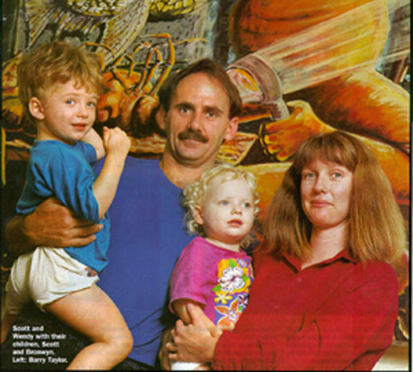 and left at 7pm. We stopped at Hungry Jack's in Lismore, went through the drive thru, then carried on home to Grafton. In the vehicle were my wife, Wendy, 29, our two children in the back seat, in their car seats - Scott Jnr, 21/2 years old, and Bronwyn, 11/2 . I, Scott Snr, 38, was driving.
