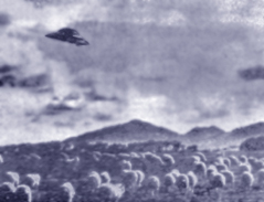 | Mr. R. Hall saw an object resting in his paddock on his property. It disappeared when he neared it. A few days later he walked over his property, he was able to photograph the craft rising nearly vertically from its grounded position amid a flock of sheep.