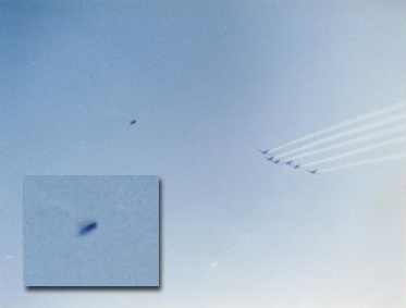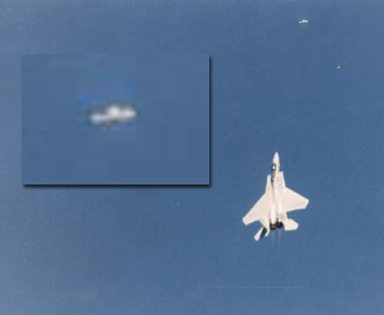 T14: This is a great photo of an F15 in flight at the Amberley Airforce Base 1988. The object in the photo is nothing more than a photographic flaw only seen when the photo was developed. (indentified) |